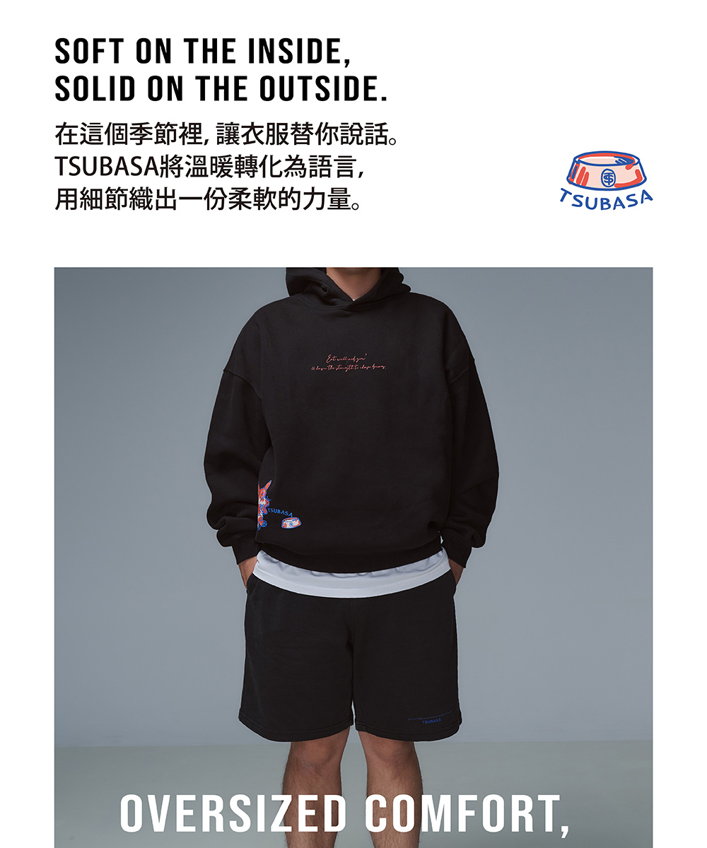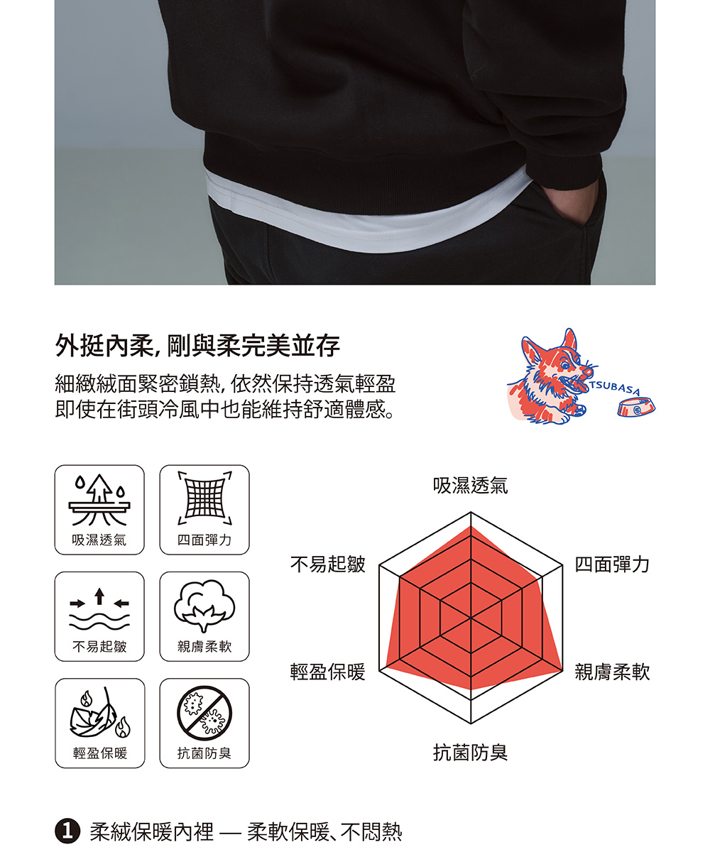 TSUBASA洒落運動衣內裡採用升級版 柔絨保暖布料,細緻絨面緊密鎖熱,卻依然保持透氣輕盈。