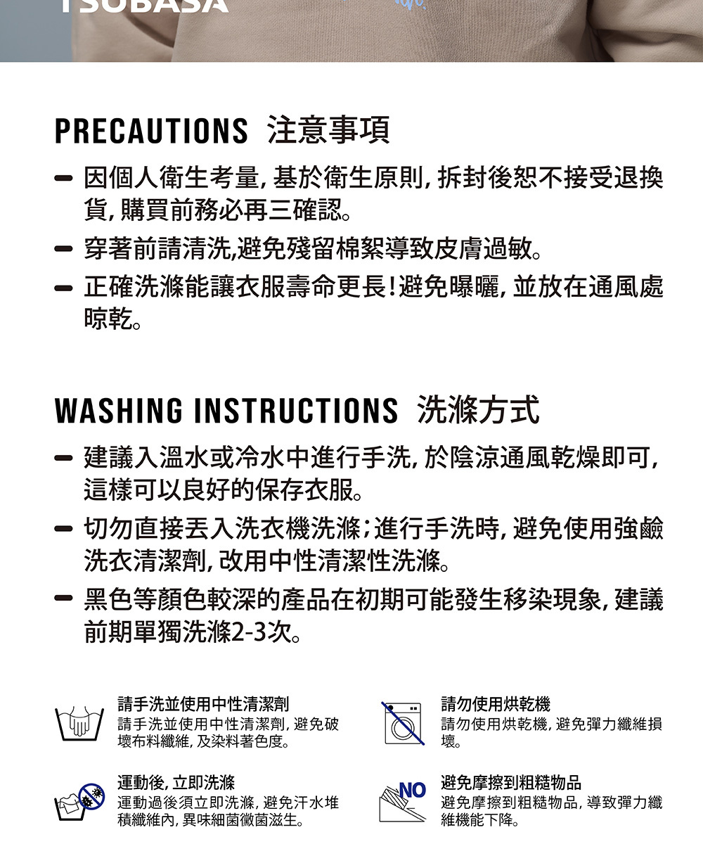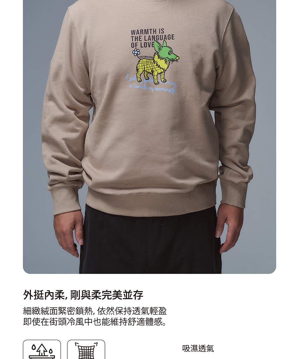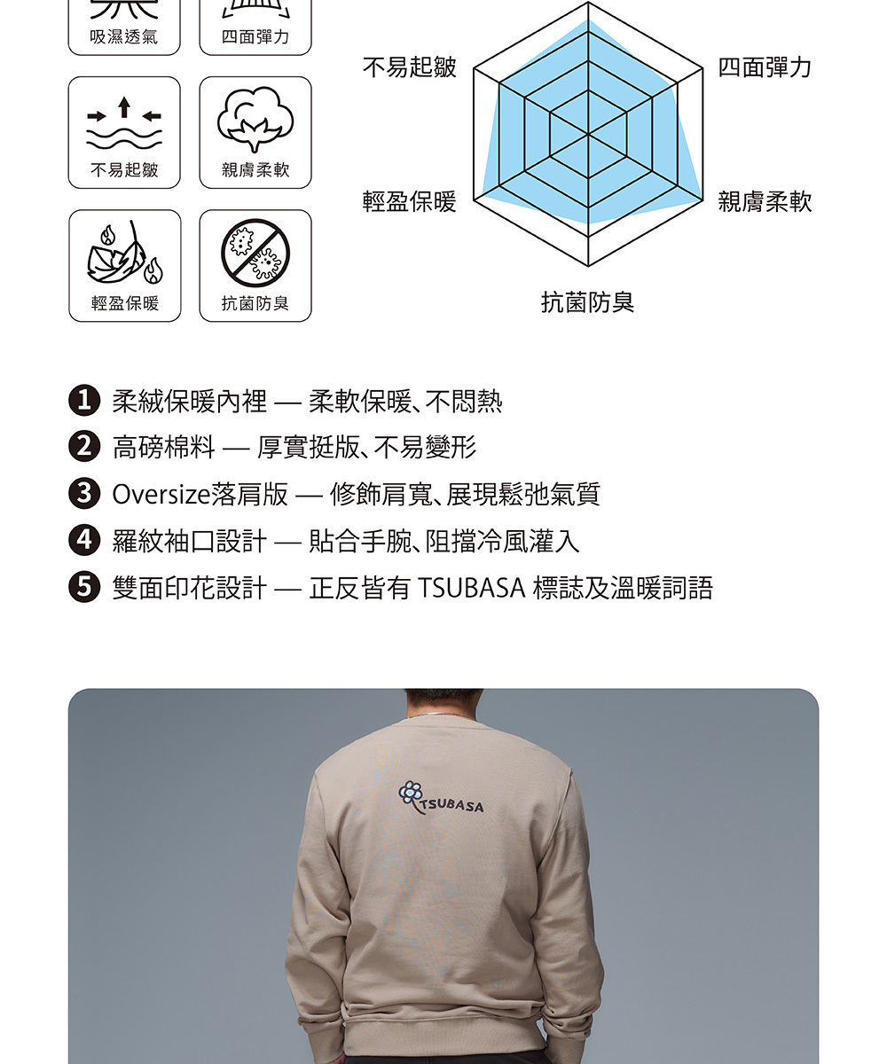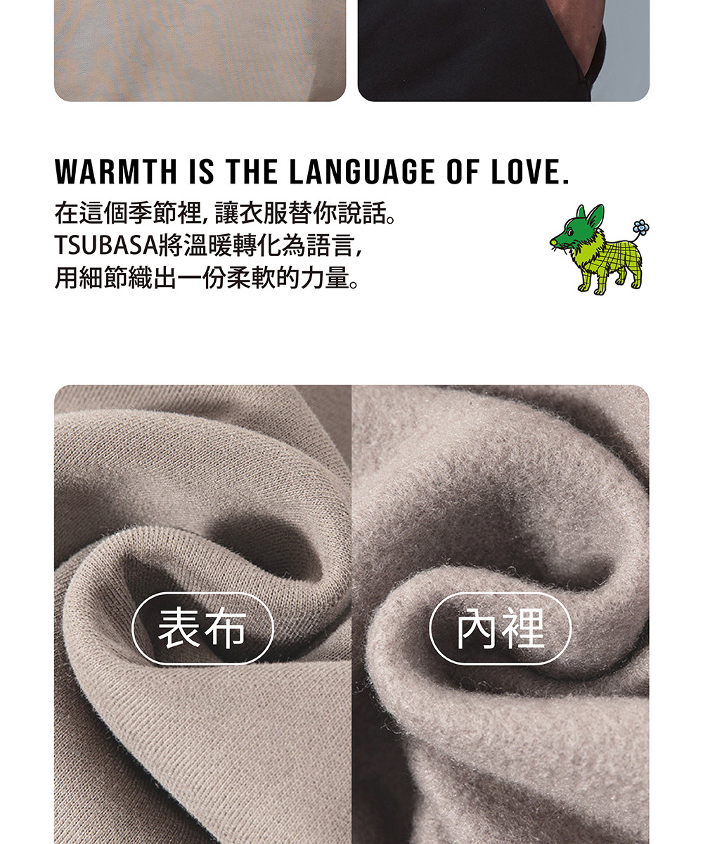 TSUBASA洒落運動衣內裡採用升級版 柔絨保暖布料,細緻絨面緊密鎖熱,卻依然保持透氣輕盈。