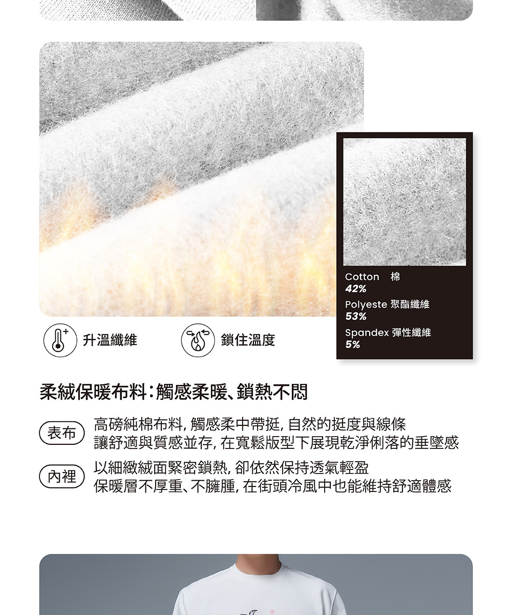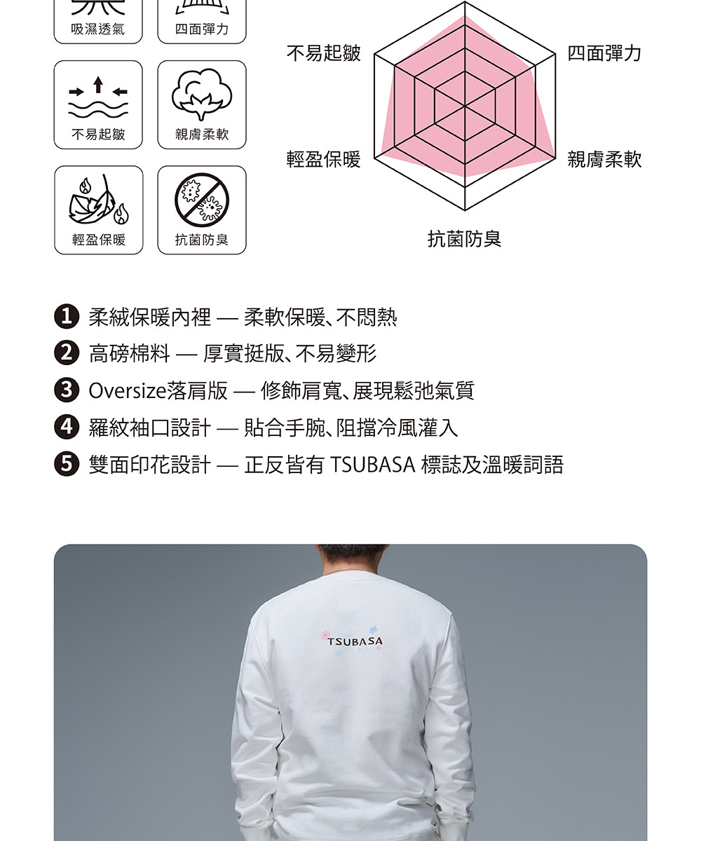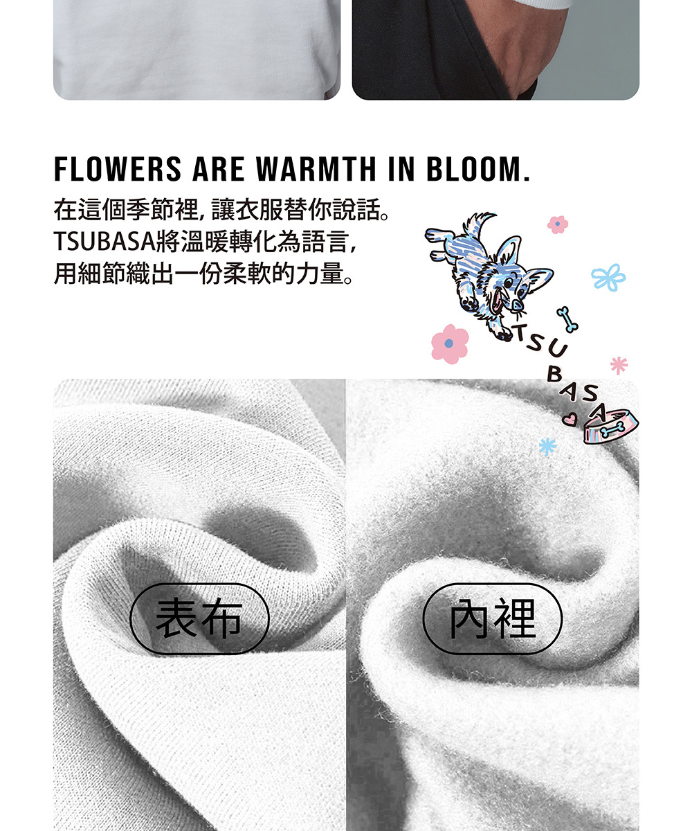 TSUBASA洒落運動衣內裡採用升級版 柔絨保暖布料,細緻絨面緊密鎖熱,卻依然保持透氣輕盈。